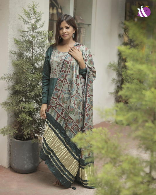 Green Dola Silk Kurta with Pant and Russian Silk Kalamkari Dupatta