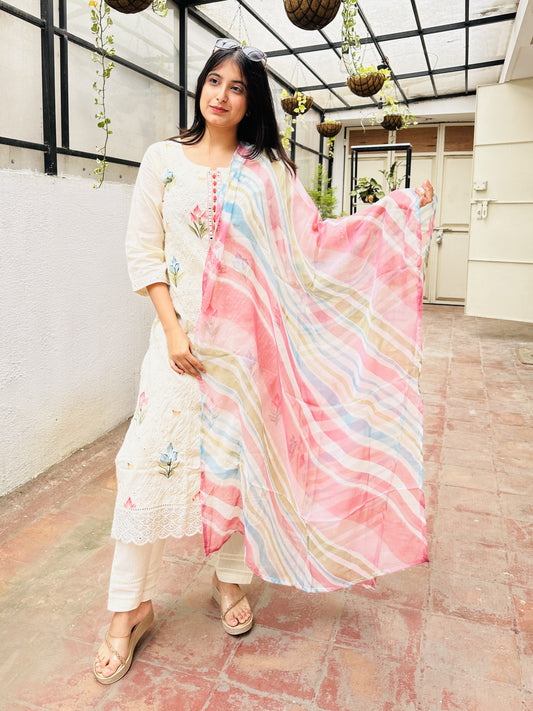 Off-White Cotton Embroidered Kurta with Pant and Multi Color Dupatta