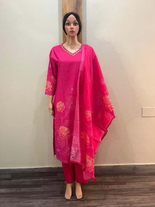 Red Floral Muslin Partywear Embroidered Dupatta Set