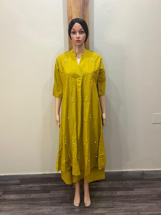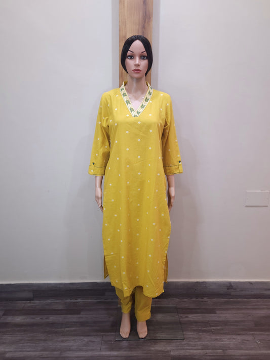 Yellow Cotton V Neck Embroidered Pant Set